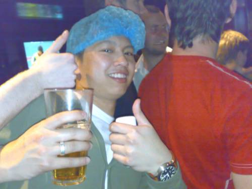 me with the shower cap on at the sports bar